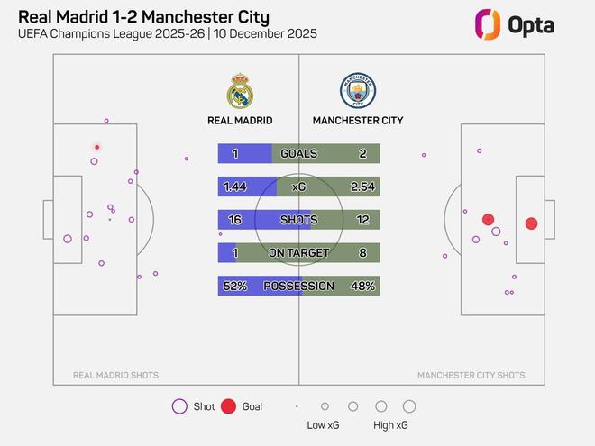 此役主场对阵曼城,皇家马德里完成16次射门,但仅有1次命中球门范围内。